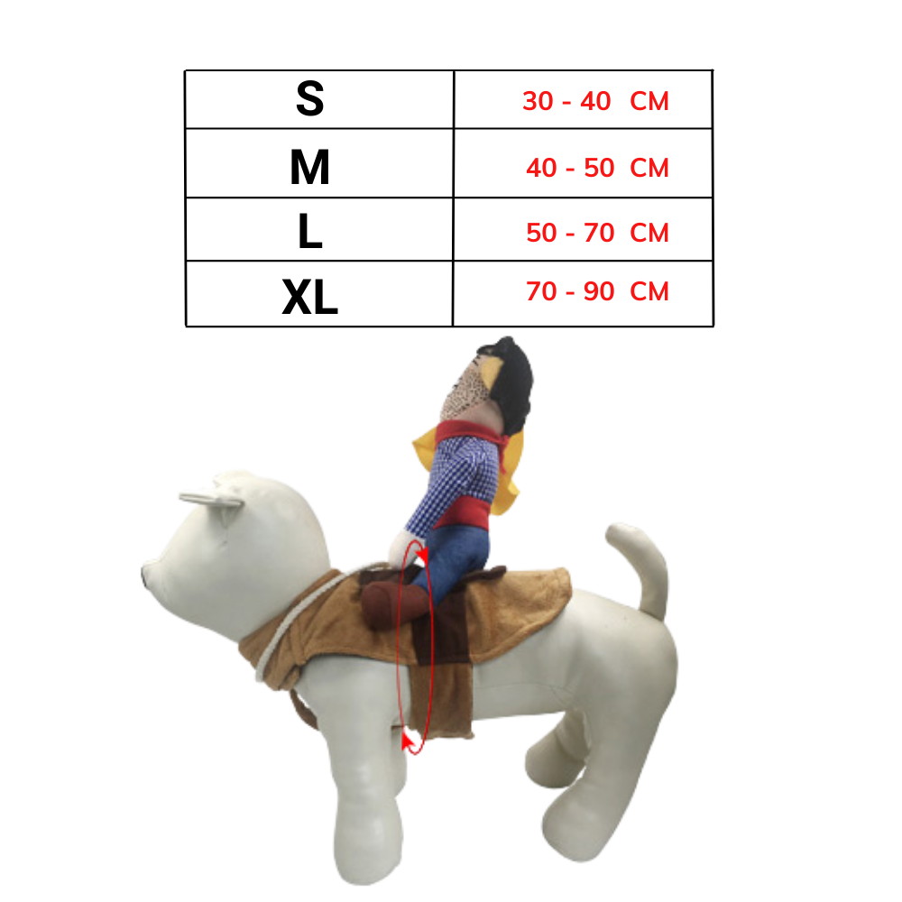 There are four sizes of pet costumes available so make sure to choose the right one. If your dog is growing fast or you find its dimensions are somewhere between two sizes, it’s always a good idea to choose the bigger one. It’s very easy to put on. Just attach the costume and adjust it using velcro. The comfortable, wide chest girth will make the item even more comfortable for your pet and will prevent the cowboy costume from falling.